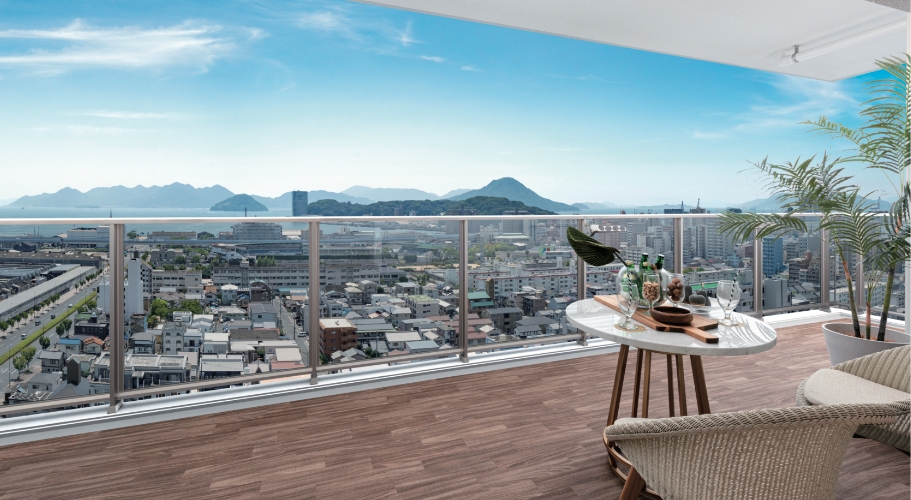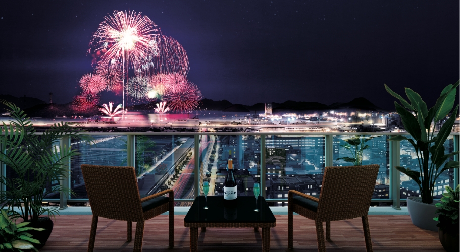 - 掲載の写真は「ヴェルディ・タワーヴィレッジ宇品[イースト]」現地19階相当の高さから撮影(2020年8月)したものにCG加工・バルコニー完成予想図・花火を合成したもので、実際とは異なります。バルコニー完成予想図は設計図面を基に描き起こしたもので、実際とは異なる場合があります。家具・調度品は販売価格に含まれません。予めご了承ください。
