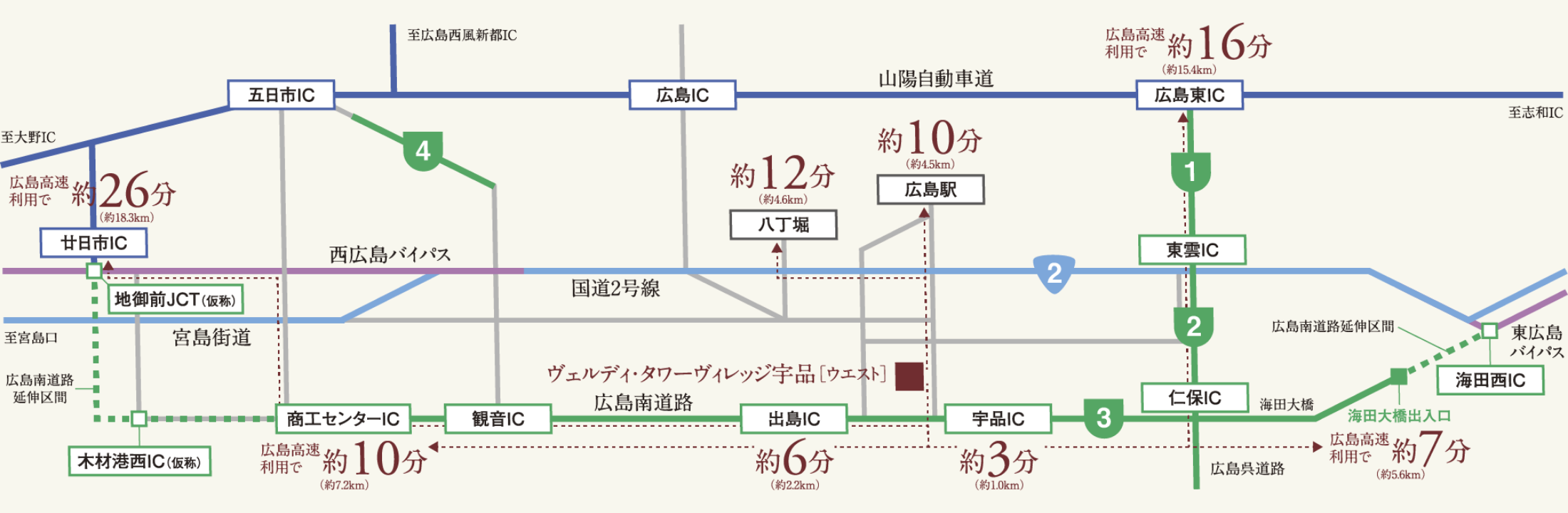 広島市内中心部への優れたアクセス性と、広島高速3号線「宇品」ICから山陽自動車道へとスムーズにつながり、県外へも行動半径が拡大。広島都市圏の湾岸エリアを東西に結ぶ広島南道路では、「木材港西」IC(仮称)から「廿日市」IC間の事業計画が発表。西方面への利便性が高まり、さらにマイカーライフが自在で快適なものになります。
