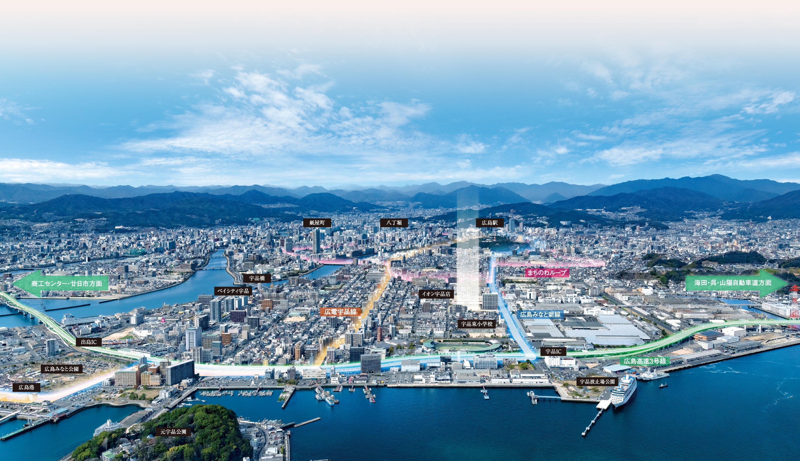宇品東エリアに「広島みなと新線」が新設され、さらにバス会社3社による路線再編により都市環状線「まちのわループ」が誕生。在来の路面電車「広電宇品線」に加え、多様な公共交通機関を選択可能に。広島駅方面や都心方面への、よりスムーズなアクセスを実現します。